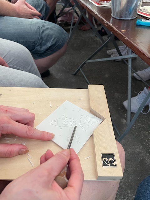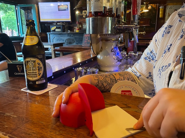 Was macht man nach der Arbeit, wenn man im Irish Pub Notenschlüssel eine gut gelaunte Gruppe kreativer Menschen trifft? Ganz einfach: Atelier-Anhänger auspacken, Druckplatten verteilen und fragen: "Wovon träumst du?" Und schon wird der Pub zum Atelier … wunderbar!