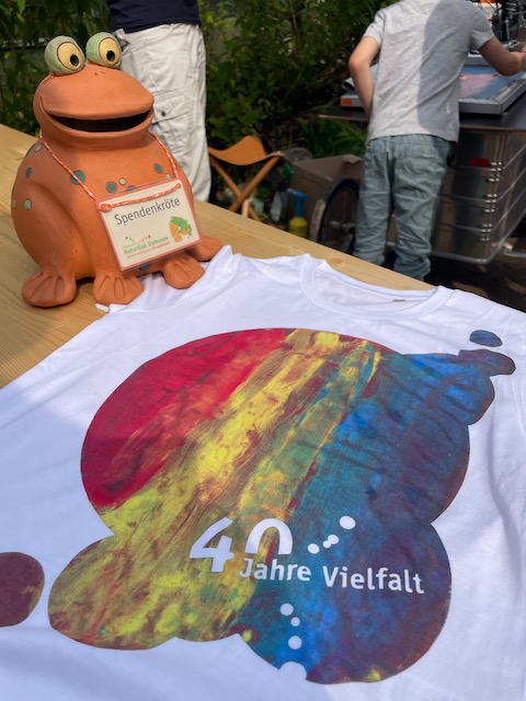 40 Jahre NaturGut Ophoven! Ich weiß noch, wie damals Dietmar Norworzyn das Schmetterlings-Logo gezeichnet hat … Jetzt werden Teile davon zusammen mit fantastischen Malereien auf T-Shirts gedruckt. Wenn ihr ein solches Shirt seht, könnt ihr sicher sein: Es ist am Jubiläumsfest vor Ort im NaturGut entstanden!